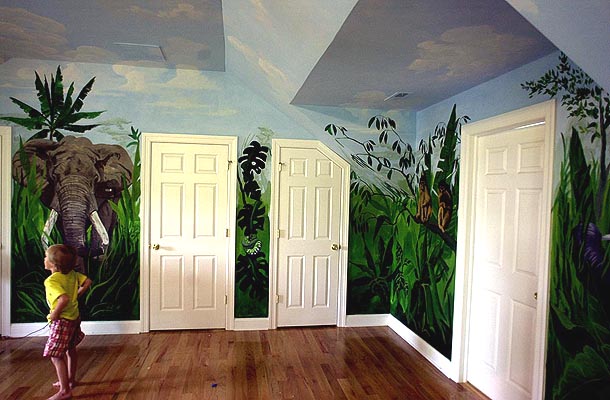 This jungle scene was painted in a room over a three car garage.