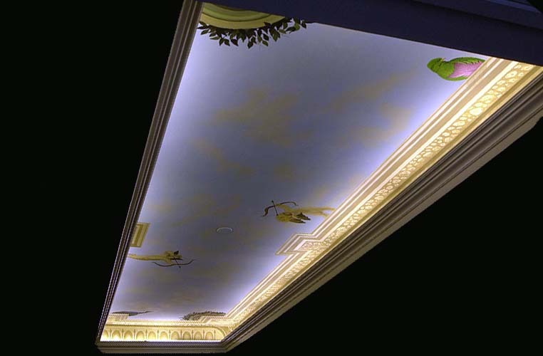 This ceiling was painted by Jim and I for Piccola Italia restaurant in Ocean, NJ., and finished on 12/3/01. It's 8' wide and about 25' long and my neck is still stiff from looking up. For details please click