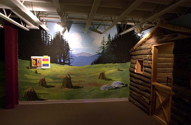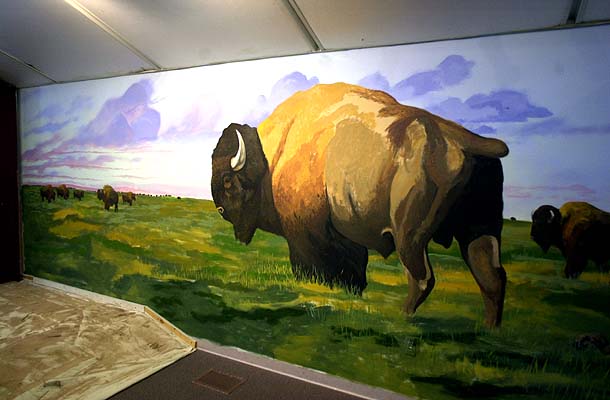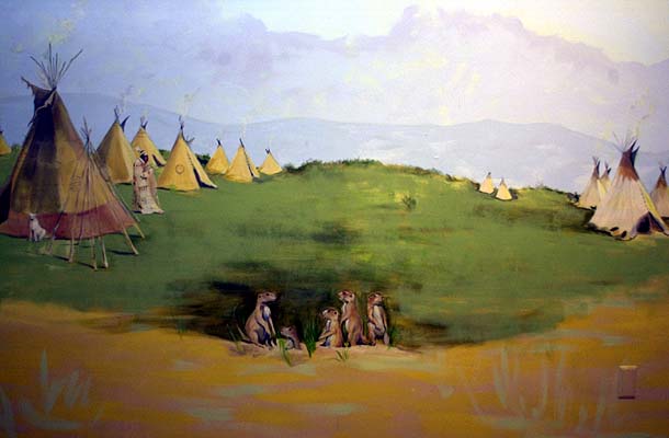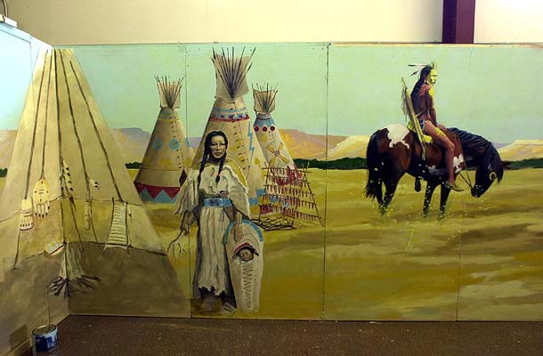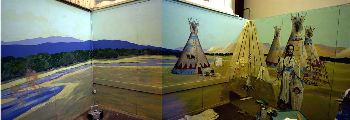 When this wall was finished the Teepee was 3 -D and you could look in through the doorway and see the interior. The mural continues on some 20' to the right and left.