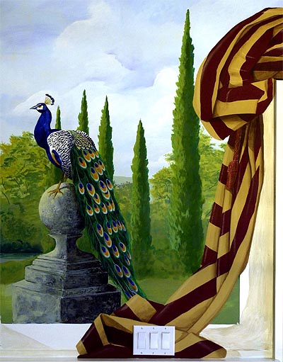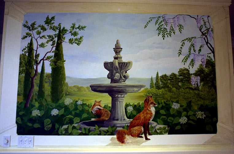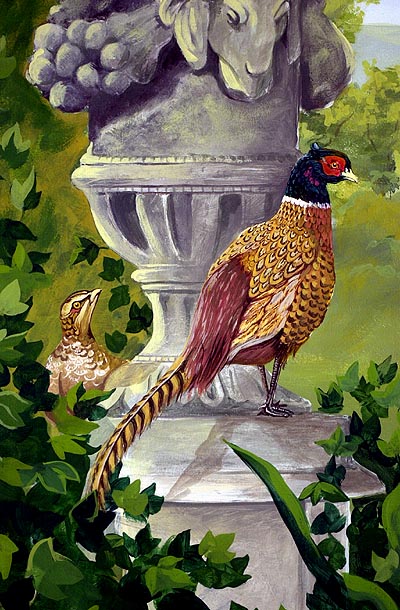 My wide angle lens caused some distortion here and Jim added 2 goldfinches after I took this shot. One on the fountain and one flying to it.