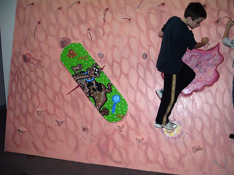Kathy Polenberg painted this climbing wall of skin. Open sores, hair, and I love that Scooby-Doo Band-Aid Bandage